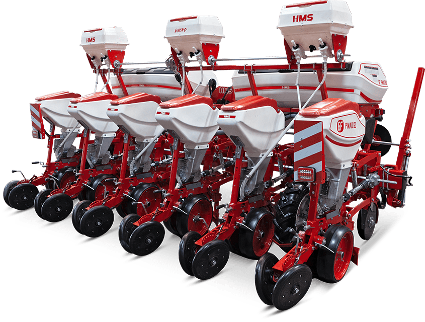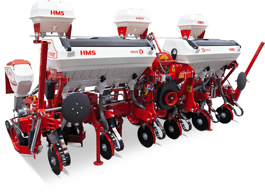 Οι πνευματικές σπαρτικές μηχανές ακριβείας HMS Disc επιτρέπουν την ακριβή σπορά όλων των τύπων σπόρων στην επιθυμητή απόσταση και απόσταση μεταξύ των γραμμών. Μπορούν να κατασκευαστούν με 4, 6 ή 8 σειρές, ανάλογα με τις ανάγκες. Το σπορείο ανοίγει με δίσκους στις μονάδες σποράς. Κάθε μονάδα σποράς διαθέτει δύο δίσκους κατασκευασμένους από ειδικό υλικό. Δεδομένου ότι η κίνηση από τους τροχούς μεταδίδεται στις μονάδες σποράς μέσω μηχανισμού άξονα, είναι δυνατή η ακριβής σπορά σε απόσταση μεταξύ των γραμμών. Χάρη στους ελαστικούς τροχούς και στις δύο πλευρές των μονάδων σποράς, μπορεί να γίνει ακριβής ρύθμιση του βάθους σε όλες τις εδαφικές συνθήκες. Ο σπόρος συμπιέζεται από τροχούς πίεσης σχήματος V που βρίσκονται στο πίσω μέρος της μονάδας. Η πίεση και η γωνία που εφαρμόζεται από τον πίσω τροχό πίεσης μπορούν να ρυθμιστούν μέσω ελατηρίου. Οι τροχοί πίεσης σχήματος V εμποδίζουν τον σχηματισμό κρούστας στο έδαφος. Οι μονάδες σποράς δίσκου επιτρέπουν τη σπορά σε πρώιμες εδαφικές συνθήκες. Οι πνευματικές σπαρτικές μηχανές τύπου δίσκου είναι κατάλληλες για σπορά σε κορυφογραμμές. Διάφορα αξεσουάρ μπορούν να τοποθετηθούν ανάλογα με τις ανάγκες. Με την υψηλή ταχύτητα εργασίας και την εξαιρετική του απόδοση, είναι μια μηχανή σποράς που εξοικονομεί χρόνο και παρέχει υψηλή απόδοση.
